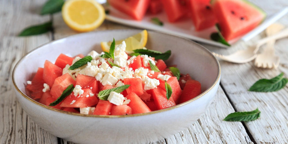 ½ Wassermelone, gewürfelt 150 g Feta, gewürfelt oder zerbröselt